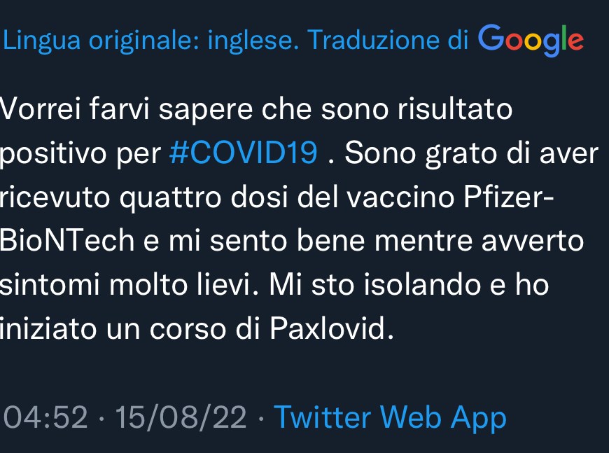 È lo stesso CEO della Pfizer a raccontarci la storia di una grande burla. O di un grande inganno, se preferite. Un vaccino talmente miracoloso che non immunizza, non impedisce la trasmissione del virus e devi prenderlo a intervalli regolari se vuoi che sia “efficace”. Ciò che stupisce maggiormente, però, è che nonostante le 4 dosi di vaccino assunte, Albert Bourla abbia deciso di curarsi … Continua a leggere Quando si dice “nomen omen”: Albert Bourla, di nome e di fatto
